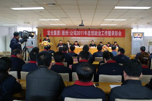寶光集團(tuán)2011年思想政治暨表彰會(huì)于3月31日在科技大樓二層會(huì)議室隆重召開。在主席臺(tái)上就座的領(lǐng)導(dǎo)有:李明鑫、李軍望、岳永學(xué)、張軍、蔣華明、朱安珂、胡唯、付宗喜。全體中層干部、各分會(huì)主席、團(tuán)支部書記,受表彰的先進(jìn)集體和先進(jìn)個(gè)人代表參加了會(huì)議。