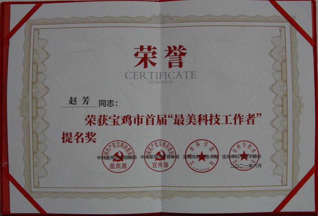 近日,寶光股份趙芳在中共寶雞市委組織部、中共寶雞市委宣傳部、寶雞市科學(xué)技術(shù)局、寶雞市科學(xué)技術(shù)協(xié)會聯(lián)合開展的“尋找寶雞最美科技工作者”評比活動中,被授予2021年“優(yōu)秀科技工作者”提名獎。