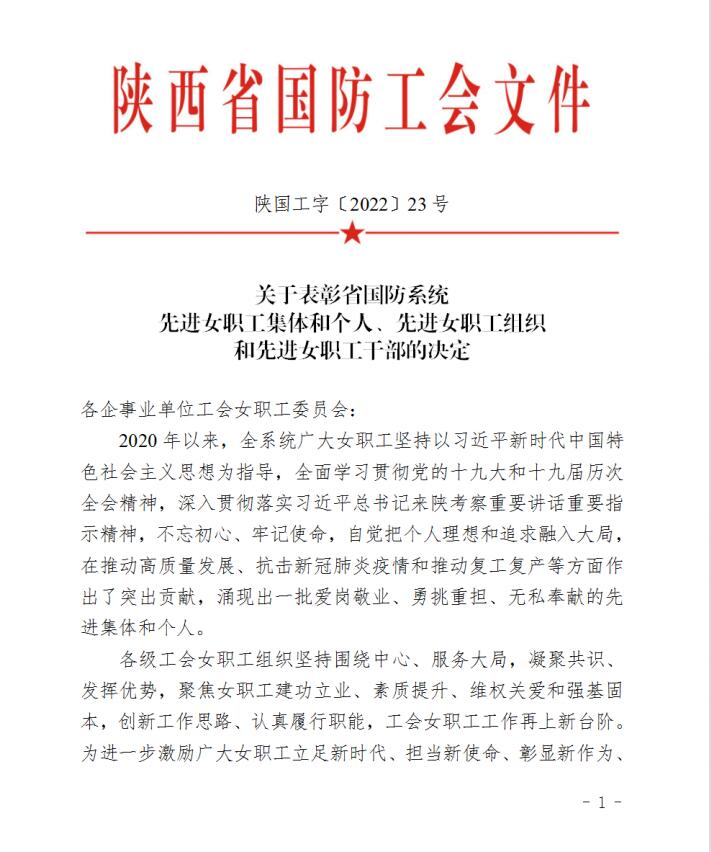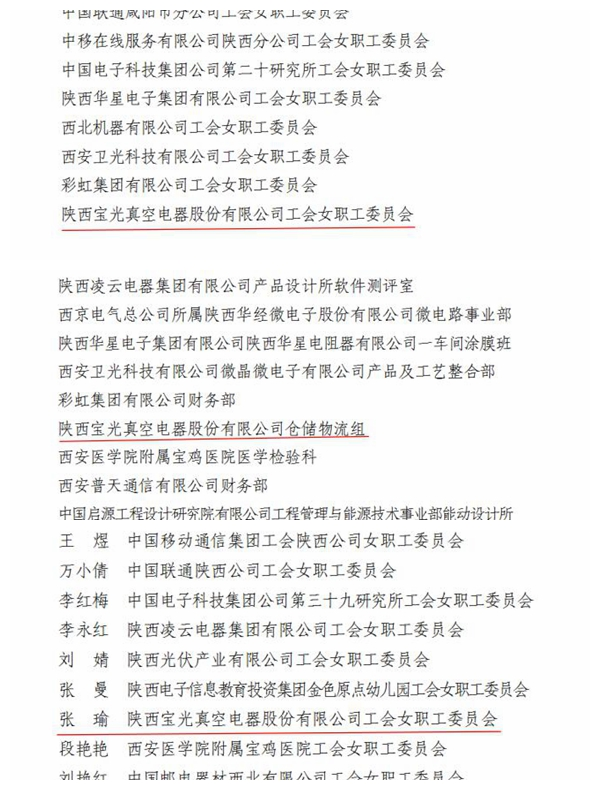 近日,從陜西省國防工會(huì)傳來喜訊,陜西寶光真空電器股份有限公司工會(huì)委員會(huì)女職工委員會(huì)被授予“陜西省國防工會(huì)先進(jìn)女職工委員會(huì)”榮譽(yù)稱號(hào),生產(chǎn)管理處倉儲(chǔ)物流組被授予“陜西省國防科技工業(yè)五一巾幗標(biāo)兵崗”,工會(huì)辦公室張瑜同志被評為“陜西省國防工會(huì)先進(jìn)女職工干部”榮譽(yù)稱號(hào)。